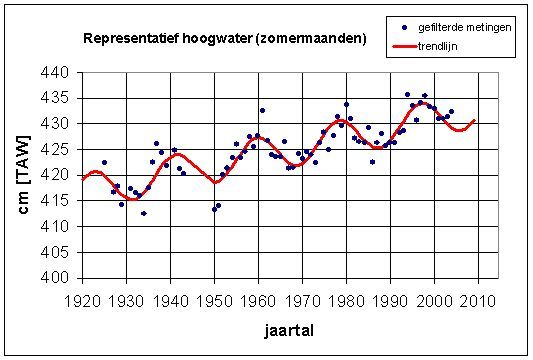 Als je de laatste 30 jaar van de eigenlijke metingen vergelijkt (d.w.z. het bolletje van 1974 t.o.v. het bolletje van 2004, de laatste meting in deze grafiek), dan zie je stijging van nauwelijks 7 cm. Maar als je een langere periode beschouwt, blijkt dat het relatieve zeeniveau bij hoog water te Oostende op 85 jaar tijd met ca. 15 cm is gestegen.