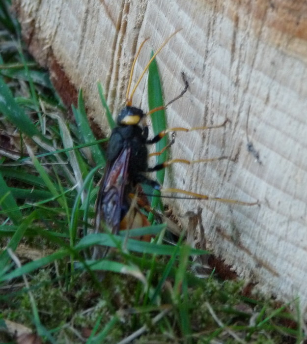 Dit insect is een houtwesp (familie Siricidae), op het eerste zicht lijkt het hier te gaan om het wijfje van de reuzenhoutwesp Urocerus gigas. Typische kenmerken van deze wesp zijn de gele poten, een grotendeels geel achterlijf, en de typische geelgekleurde vlek achter elk oog. Eveneens kenmerkend voor het wijfje is de legboor die achteraan uitsteekt. Met deze legboor is het wijfje in staat om eitjes te leggen in dennen- en sparrenstammen (naaldbossen), tot 1 cm diep in het hout. Uit die eitjes ontluiken de larven, die zich in het hout gaan voeden. De ontwikkeling van de pootloze larven duurt doorgaans 2 tot 3 jaar.