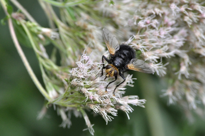 Volgens mij een sluipvlieg (Tachinidae) gelet op de stevige borstels op het achterlijf. Ze bezoeken geregeld bloemen dus het is niet ongewoon om ze hierop te vinden.