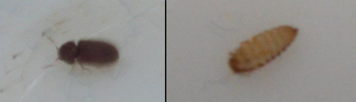 Ik woon in een studentenhuis en nu kwam ik dit insect tegen met nog een aantal van zijn vrienden rond de koelkast. Dit was de grootste die ik kon vinden +- 2 a 3 mm. Hij heeft 6 pootjes en twee kleine voelsprietjes. Ik vond er ook nog dit eitje (?) bij wat ik aan de rechterkant heb weergegeven.