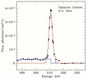 Indien een elektron en een positron botsen zullen ze elkaar annihileren. Hun massa wordt daarbij volledig omgezet in energie volgens de gekende formule E = mc2. Er ontstaan dan twee gamma-fotonen (dit zijn zeer energetische fotonen, nog energetischer dan X-stralen). De fotonen hebben elk een energie van 511keV. Hun gezamelijke energie stemt precies overeen met de totale massa van het gebruikte elektron en positron. Annihilatie van electronen en positronen is een proces dat nog steeds veelvuldig actief is in het heelal. Het is te herkennen aan de hierbij geproduceerde gammastraling van 511 keV. De 2de figuur bij dit antwoord toont het gammaspectrum van het centrum van onze melkweg, met een duidelijke emissie op 511 keV.