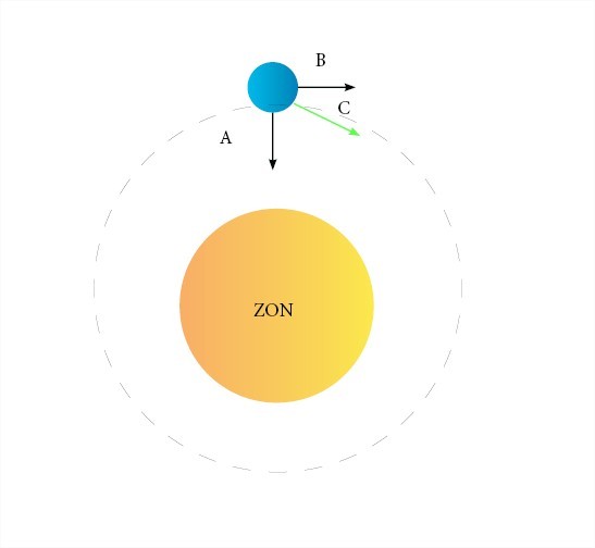 Omdat die krachten allebei aanwezig zijn, zullen ze een effect hebben op elkaar. Als je kracht A en B optelt, resulteren ze in de kracht C die er voor zorgt dat onze aarde mooi rond de zon blijft draaien.