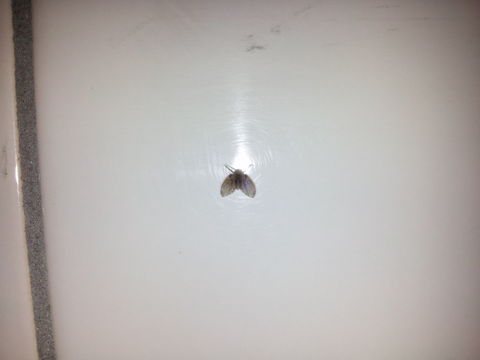 dit zijn motmuggen, motvliegjes of ook nog aalputmotjes genoemd. De kans is heel groot dat het om Psychoda alternata gaat. Ze worden vaak aangetroffen in de woning in de buurt van allerhande aflopen. Deze motmugjes kan je herkennen aan de sterk behaarde vleugels en de vrij lange antennes. De larven voeden zich met allerhande organisch materiaal. De bron van infectie is allicht de afvoerput. Meer info kan je vinden op http://www.provant.be/binaries/motmugje_tcm7-14250.pdf