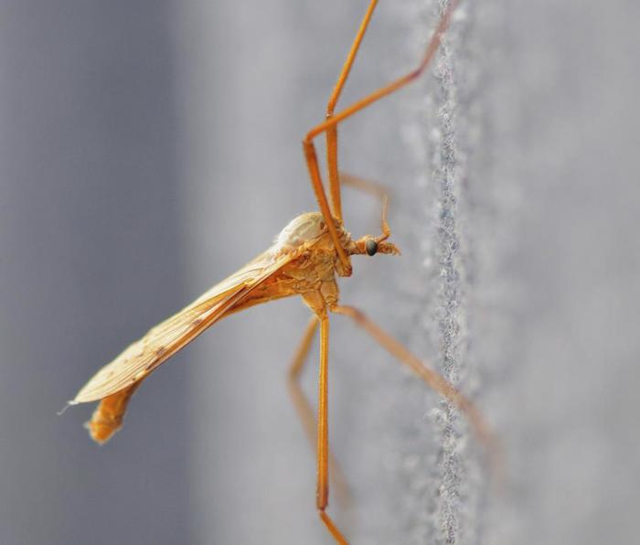 dit is inderdaad een langpootmug (familie Tipulidae). Veel langpootmuggen hebben een donker kleurenpatroon, maar er zijn ook langpootmuggen met oranje en gele kleurschakeringen. Langpootmuggen zijn duidelijk te herkennen aan de vrij lange poten enerzijds en het tweede paar vleugels dat gereduceerd is tot halters of kolfjes, maar ook aan de wat uitstekende monddelen, duidelijk op jouw foto waar te nemen.