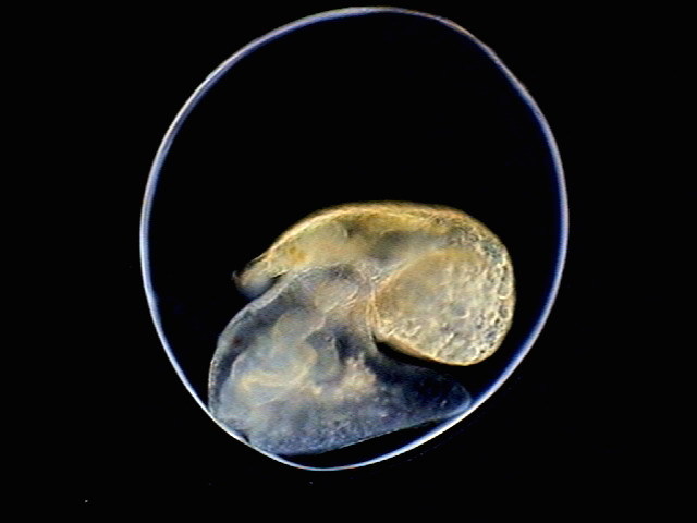 In het filmpje zie je bijvoorbeeld een babyslakje van een appelslak dat nog in het eitje zit. Het babyslakje beweegt in het eitje en als je goed kijkt zal je de oogjes zien (twee donkere puntjes). Verder zie je ook duidelijk het huisje.