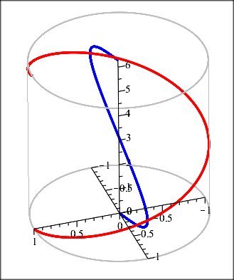 Als je een touw rond een cilinder wentelt op de manier waarop je het tekent, dus een een constante verschuiving in de horizontale riching op jouw tekening, dan krijg je een zogenaamde schroeflijn. Bijvoorbeeld, neem een cilinder rond de z-as met straal a, en beweeg met constante snelheid b omhoog terwijl je ronddraait met periode 2.pi , dan krijg je: