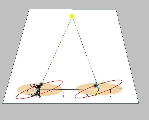 Een maand later is de aarde (met haar maan) een eind in haar baan opgeschoven. Wanneer de maan nu weer "nieuw" is zien we de maan nu in een kleine hoek (blauw) onder de zon staan. Dus geen eclips. Ik doe hier alsof de orientatie van de knopenlijn een constante richting aanhoudt tegenover de sterren. Dat is niet zo, die lijn roteert ook langzaam. Maar dat maakt het allemaal nog ingewikkelder. De hoofdreden waarom we niet elke maand een zoneclips zien is dus het feit dat de maanbaan een hoek maakt het eclipticavlak.