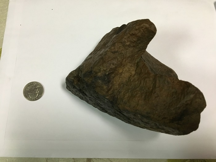 Ik vrees dat ik u zal moeten teleurstellen. Op basis van uw beschrijving en foto lijkt deze steen geen kenmerken te vertonen van een meteoriet. Wat me vooral opvalt is het "schilferachtig" voorkomen van het bovenvlak van de steen, die mogelijk wijst op de aanwezigheid van een zekere foliatie. Roodbruin wijst meestal wel op aanwezigheid van geoxideerd ijzer. Zwarte kleur van oppervlak kan ook het gevolg zijn van verweringsprocessen. Daarom klopt de geoloog op terrein met zijn hamer steeds een stuk af van een steen, om zo een vers breukvlak te hebben van het gesteente. Dat helpt om het te identificeren.
