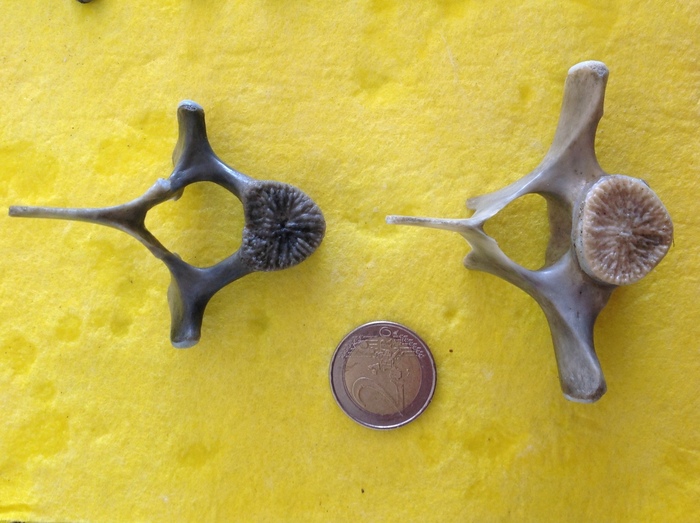 gelet op de vindplaats, de grootte en de vorm van de wervels, en na korte vergelijking met ons eigen collectiemateriaal, durf ik wel te stellen dat beide wervels afkomstig zijn van een bruinvis. Dit is inderdaad, in tegenstelling tot wat de naam laat vermoeden, een zeezoogdier, meer bepaald de kleinste tandwalvis die we kennen. Bruinvissen lijken sterk op dolfijnen. De laatste jaren is hun aantal in de Noordzee zeer sterk toegenomen, en helaas spoelt er ook zeer regelmatig eentje aan aan onze kust.