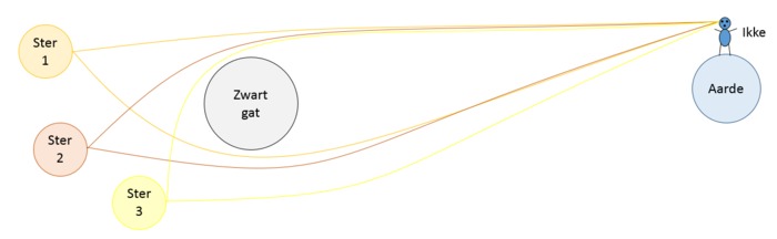Licht wordt gebogen onder invloed van zwaartekracht. Een zwart gat = veel zwaartekracht en dus mogelijks veel afbuiging: alle licht van alle sterren die een zwart gat dicht genoeg passeren, wordt voldoende afgebogen om potentieel van overal zichtbaar te moeten zijn. Als je richting een zwart gat kijkt, dan zou je eigenlijk zowat alle licht van alle sterren moeten zien, een zwart gat zou dus een heel helder object moeten zijn met een vrij breed kleurenspectrum.