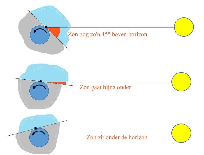 Ik maak het duidelijk op de tekening. Die toont driemaal de Aarde en de Zon. De Aarde staat links, U bent de zwarte stip. Alles boven uw horizon (de schuine lijn) is voor u zichtbaar, het grijze deel er onder is voor u niet zichtbaar want dat bevindt zich voor u onder uw horizon. De pijl op de Aarde toont de richting waarin ze om haar as roteert.