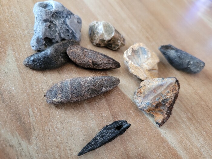 Dit is een allegaartje van leuke steentjes. De lichtgekleurde rechts lijken me verkiezeld te zijn en bevatten schelpen. De drie donkerbruine links lijken me gerolde fragmenten van fossiele beenderen (met botstructuur) en de grijze bovenaan is waarschijnlijk een kalksteen. De zwarte onderaan zou een fragment van een vis of fossiel hout kunnen zijn - moeilijk te zien.