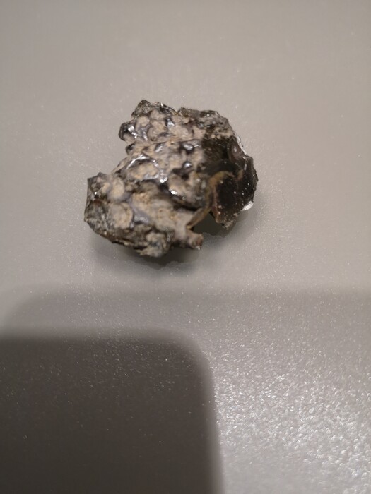 Het lijkt me geen grote steen (met een schaal, meetlat, muntstuk,... erbij, zou dat inschatten makkelijker zijn geweest) én het ziet ernaar uit dat er één of ander metaal inzit. Het ziet er ook gesmolten uit. Dat doet natuurlijk direct denken dat je een meteoriet gevonden hebt.