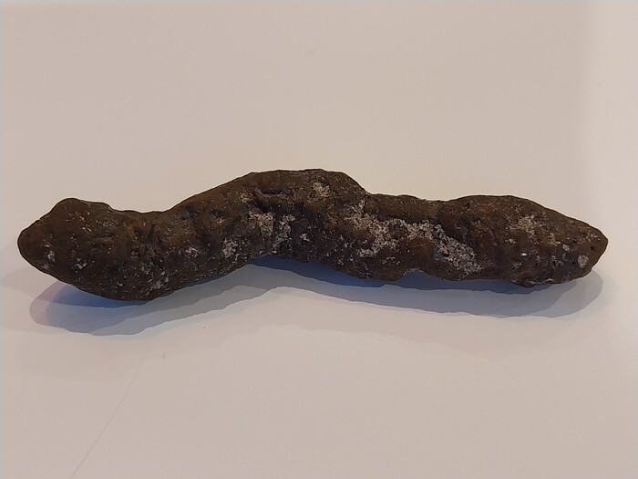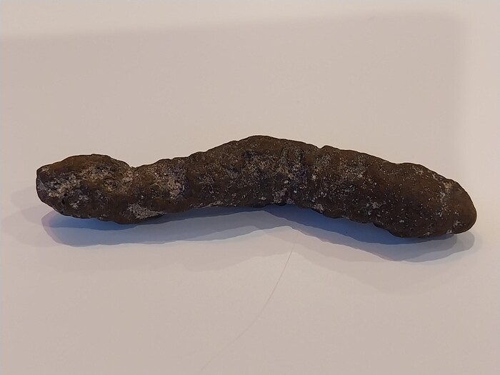 Als het object 6-7 cm lang is, is het een centimeter dik ofzo, een langwerpig dun stuk dus, ongeveer de grootte van mijn pink. De kleur en het voorkomen van de buitenkant doen me denken aan een stuk ijzerdraad dat door in het water te liggen verroest is. Of een takje dat omgeven met iets is, samengekoekt zand ofzo.