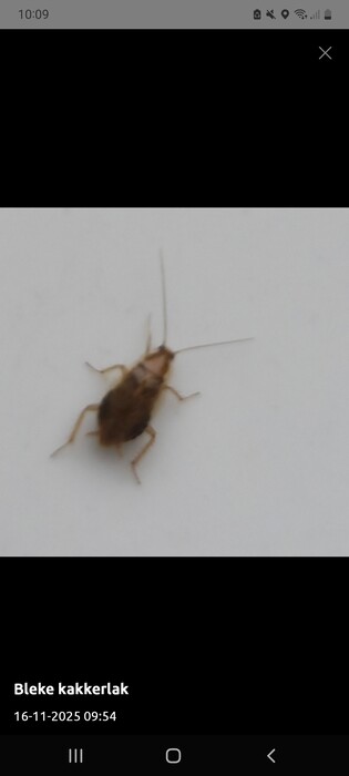 Deze bleke kakkerlak (Ectobius sp.) behoort tot de boskakkerlakken (Ectobiidae), welke van nature bij ons voorkomen en buiten in de vrije natuur leven. Ze komen vooral voor in bossen, heiden, duinen en weiden. Het zijn bodem- en vegetatiebewoners; zij voeden zich met rottend organisch plantenmateriaal (zoals afgevallen bladeren). Deze kakkerlakken worden weleens gevonden in gebouwen; ze komen via naden en kieren of door openstaande ramen en deuren het gebouw binnen. Ook met vers gekapt haardhout kunnen grote aantallen boskakkerlakken direct vanuit het bos meegenomen worden. In gebouwen kunnen deze soorten zich niet handhaven en zullen dus geen langdurige plaag vormen. Een bestrijding is niet wenselijk en niet noodzakelijk. Enkele aangetroffen exemplaren kunnen fysiek verwijderd en buiten uitgezet worden. Om te voorkomen dat boskakkerlakken de woning binnenkomen, wordt aangeraden om naden en kieren te dichten met kit en ventilatieopeningen af te sluiten met een deugdelijk rooster of fijnmazig gaas. Ramen en deuren kunnen worden voorzien van goed sluitende horren. Om hinder in de nabije omgeving van de woning te doen verminderen, is de beste oplossing het onderhouden van het groen door regelmatig afgevallen bladeren te verwijderen.