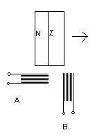 Beweging van een cilindervormige staafmagneet gemagnetiseerd op de manier aangeduid in de tekening. Een magneet beweegt zich over een spoel, in welke zin moet de spoel gewikkeld zijn om de maximale EMK op te wekken.
