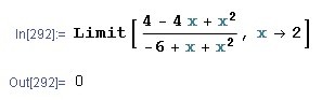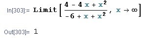 Onvermijdelijk denkt iemand met wat ervaring in wiskunde dan aan een volgende toepassing: limietberekeningen! Een mooie functie om de problemen die zich kunnen voordoen met delingen door nul en/of oneindig te illustreren is bvb. de functie (4 - 4*x + x^2)/(-6 + x + x^2).