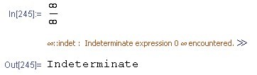 Delen we de veranderlijke x namelijk door oneindig, dan kun je de correcte uitkomst van deze bewerking al niet meer voorspelllen. Ik was dan ook onaangenaam verrast vast te stellen dat Mathematica™ in dit geval toch nul als antwoord geeft. Ik ben het eerlijk gezegd niet eens met dit gevaarlijke antwoord. Want hoe kan het programma me achteraf ooit nog het vorige antwoord "onbepaald" geven als ik x achteraf vervang (substitueer) door oneindig?