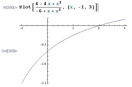 voor x gaande naar 2 worden zowel de veelterm in de teller als deze in de noemer van de functie nul, en dan wordt de functie eigenlijk 0/0. Deze deling is al even problematisch als oneindig gedeeld door oneindig. Eigenlijk zit er op deze plaats een "gat" in de grafiek van de functie. In de praktijk berekent het plot commando de functie natuurlijk slechts voor een beperkt aantal waarden van x, en daardoor "springt" de rekenomgeving over de discontinuïteit heen.
